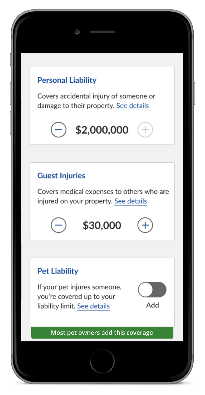 During user interviews and testing, participants mentioned they enjoyed seeing state or regional messaging. In addition to conversational voice and state or regional messaging, we also suggested coverages that our analysts felt would be of value for individuals in their particular state or region.